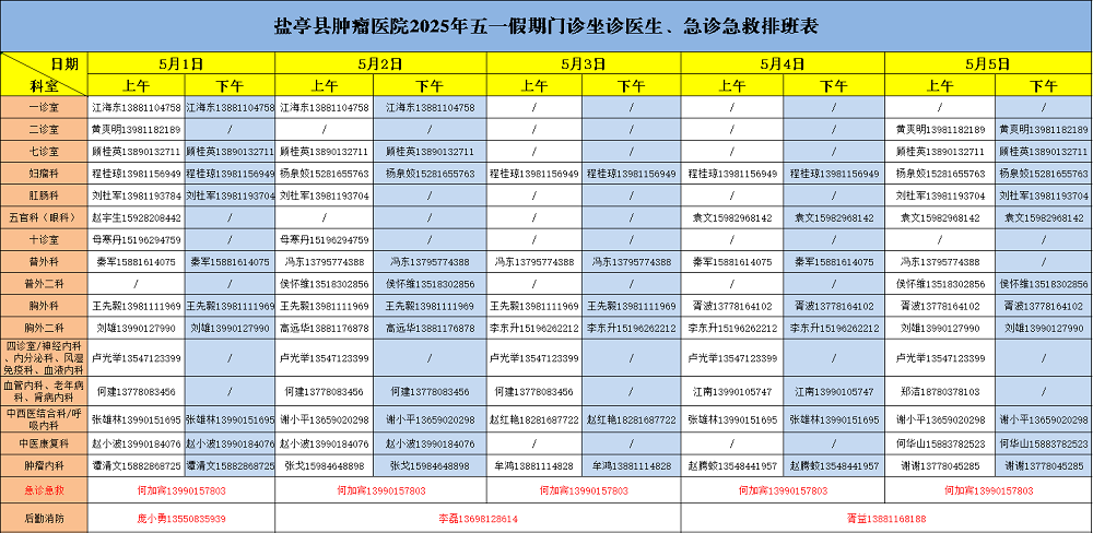 【坐诊信息】盐亭县肿瘤医院2025年五一假期排班表来啦~快收藏